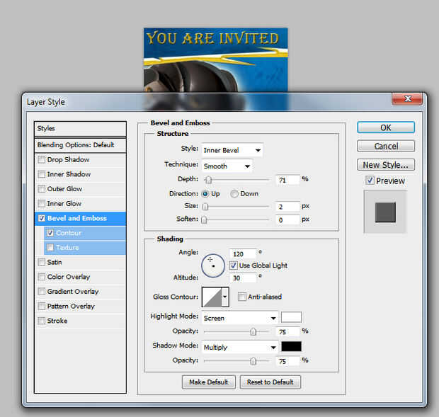 En el texto que hice me biselado y contornea el texto. Los ajustes que utilicé son en la imagen adjunta (71% profundidad, tamaño de 2px y el contorno es el valor predeterminado de 50%)