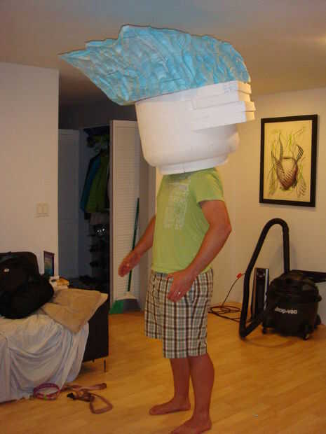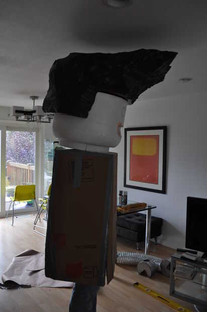 Esta técnica se aplicará a cualquier cabeza diseño usted personalmente elija hacerlo. Comience con la parte del cilindro o la cara de la cabeza. Comprar 12" tubos de forma de cemento que están hechos de un cartón revestido. Cortar dos segmentos que son ~ 22" largo. Cortar cada pieza a lo largo y extendido en un semicírculo. Usted se superponen estas dos piezas, agrega el pegamento del gorila, utilice grapas resistentes y tense la articulación. Tocar los dedos de dos punteros y dos pulgares juntos en un círculo para ver lo que me refiero.