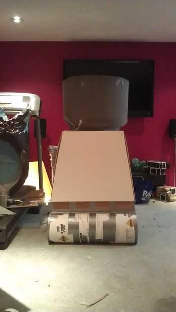 [Nota: algunas fotografías muestran un cilindro de cara de espuma de poliestireno. No hacer esto. Añade un montón de peso, espesor, lío, y es muy difícil de pegamento o pintura ya que los solventes disuelven espuma de poliestireno. Yo realmente derretido mi cabeza primero cuando intenté utilizar cemento de contacto para colocar un revestimiento superficial.]