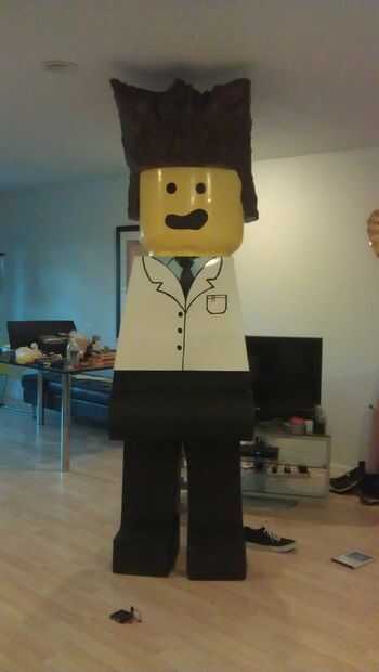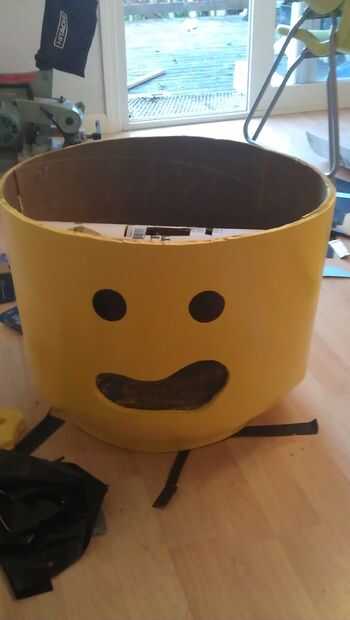 El mini-fig tiene un redondeado "chin" que se hace con un donut de espuma base densa que puede cortar con una sierra de calar. Lo de la arena o utilizar una dremel para obtener el radio correcto. El interior debe ser el diámetro de la dona 12"(lo suficientemente grande para su cabeza pasar. Usted puede poner una longitud de 4" de 12" tubería de forma de cemento para dar rigidez para soportar el peso de la cabeza. Otra vez, utilizar el pegamento gorila, abrazaderas y déjelo curar durante no menos de un día.