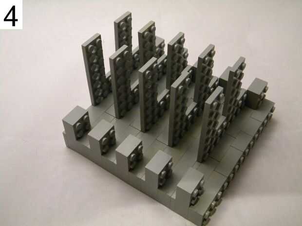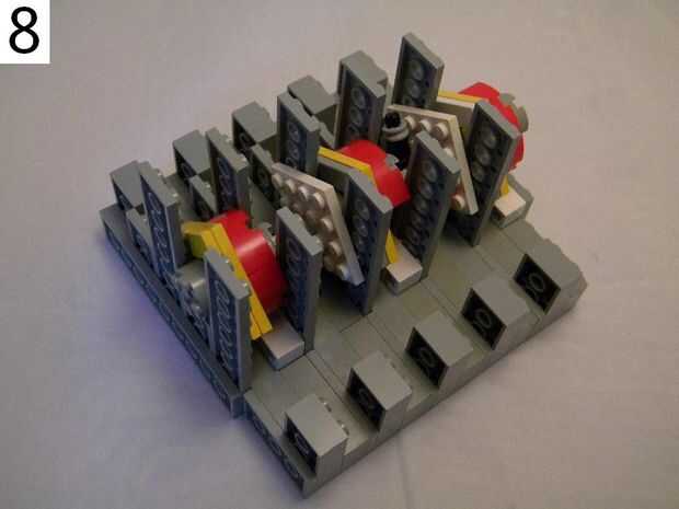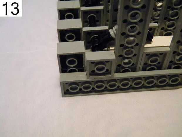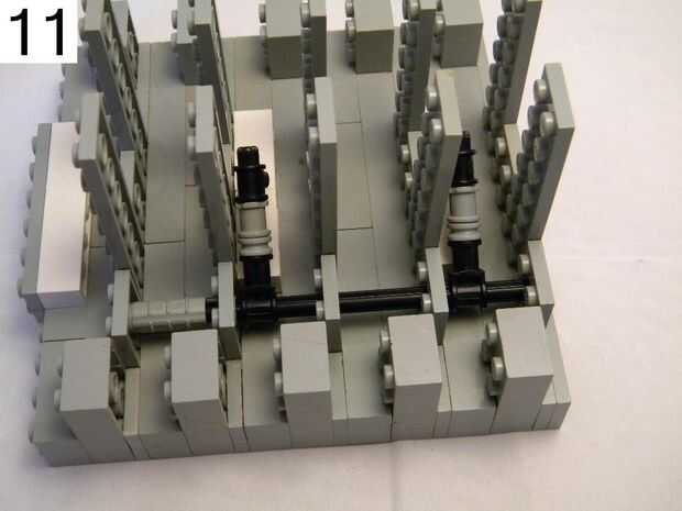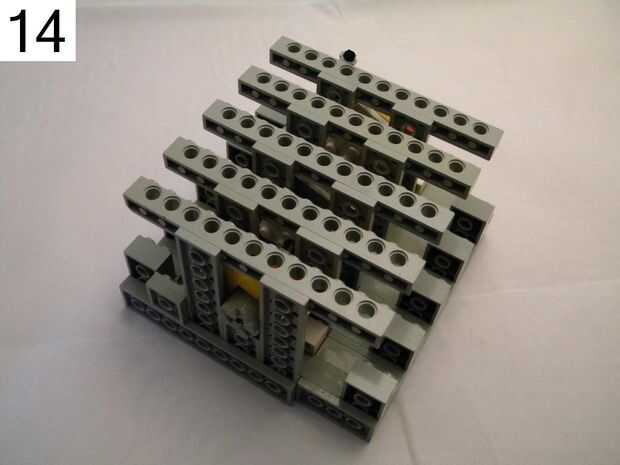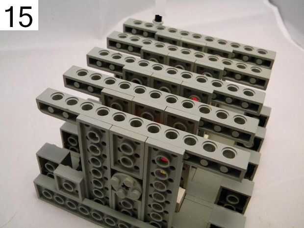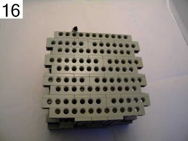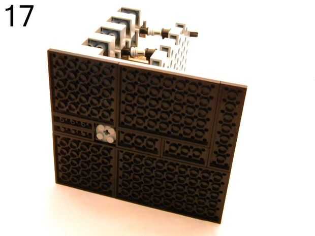 17: Hacer dos capas de placas en la espalda, dejando abierto el lugar de eje de rotor pasado. He hecho la última cara en negro porque no tengo suficientes placas gris. Usted puede cubrir el eje así, yo no, porque no es necesario. Tal vez piensas que revelaría el lugar de la pestaña 1 x 1 del rotor, eso es cierto, pero no revela el código. Porque si sólo sabe dónde está la ficha, no sabe todavía Dónde está la muesca (el ladrillo curvo ausente) del rotor.