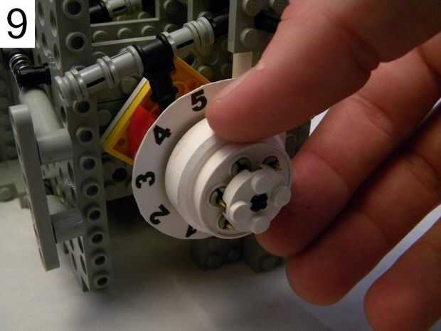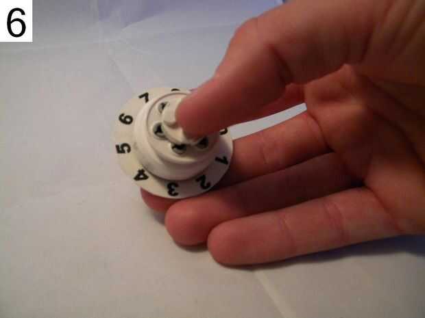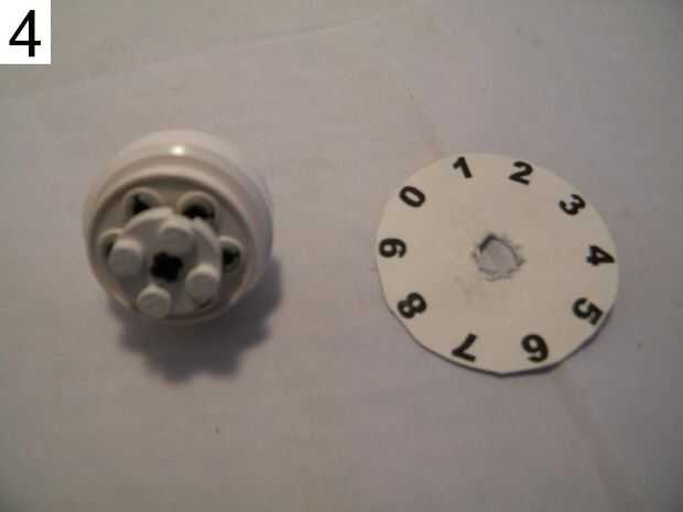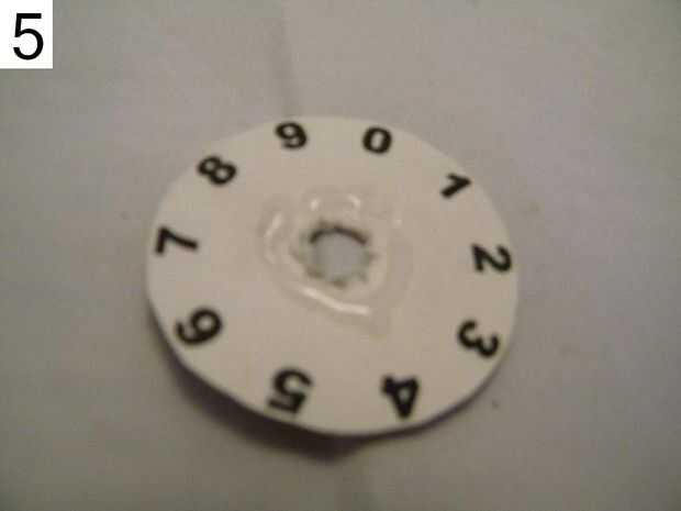 5: Poner pegamento manía en él, puede utilizar un muy poco si vas a ejecutar el paso 7 y 8 tambien. Si no quiere un poco de pegamento en el lego, se puede incluir este trabajo entre los dos discos agujereados, pero entonces hay una posibilidad de que más adelante se moverá el papel, y ya no funciona la combinación que has recordado.