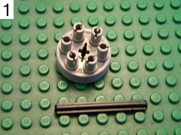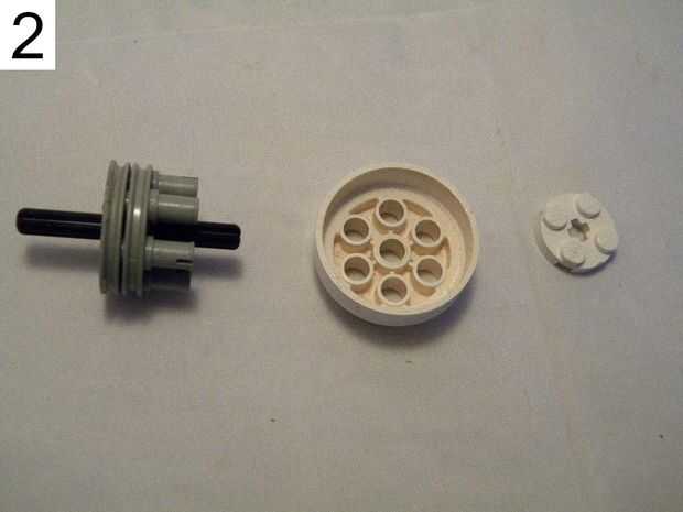 2: Tomar algunas piezas que formarán parte de la esfera para sostener en los dedos al girar. Tomé la parte interior de una rueda y una placa redonda de 2 x 2, pero puedo entender si no tienes la llanta weel. Utilizar piezas de lego similar, existen muchos de ellos como este u otros discos a utilizar para el disco, así que esto no debería ser un problema.