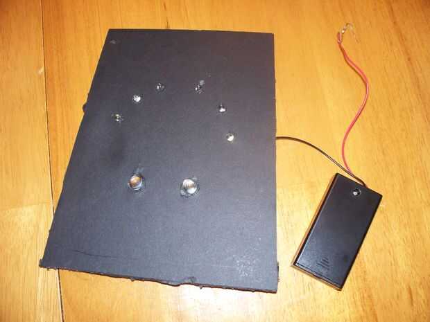 En la foto de abajo ves que tengo los LEDs insertados en la base de la espuma y cableado. Orienté todo los LEDs con el largo en la parte exterior del círculo y las puntas cortas en el interior del círculo. Esto hizo cableado y soldaduras muy simple.