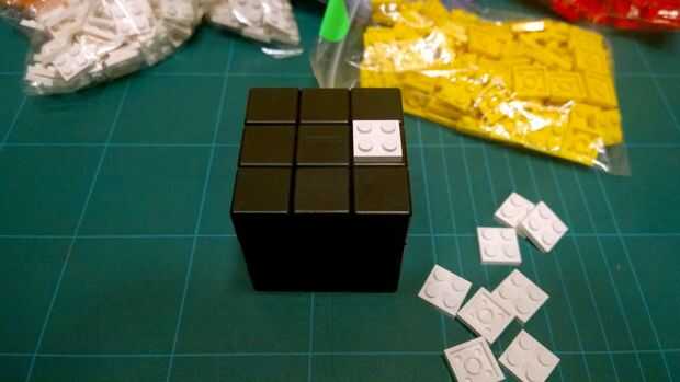 Empezar en un lado y luego al contrario. Asegúrese de que el azulejo de Lego está en medio de tu negro cuadrado base. Cualquier esquina que sobresale puede causar daños o problemas para el cubo que funciona bien.