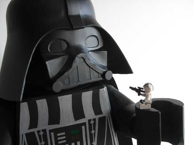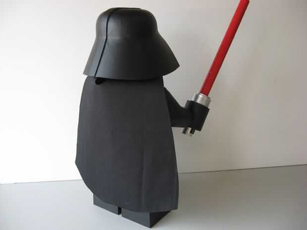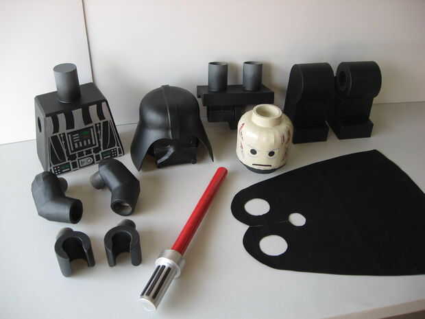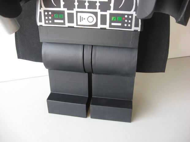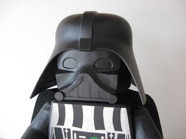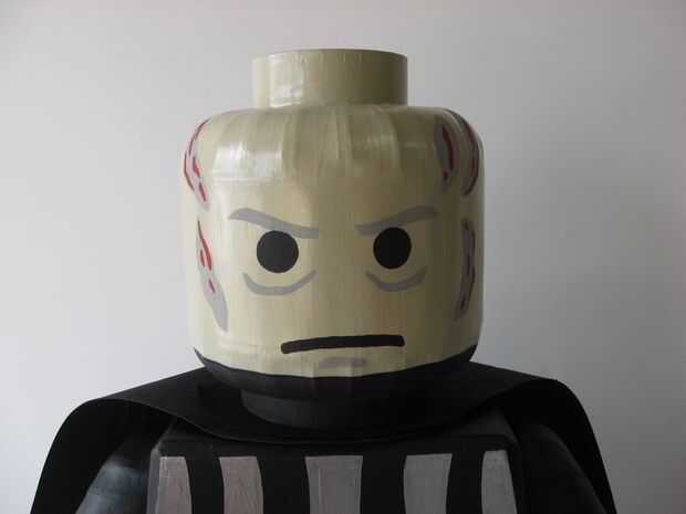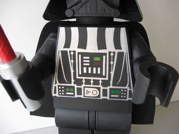Esto es un 100% hecho en casa LEGO Darth Vader traje, creado con cartón, papel maché y pintura de aerosol. Compré un llavero de LEGO Darth Vader de la tienda LEGO en el centro comercial y utiliza para escalar las medidas y las proporciones. Este traj