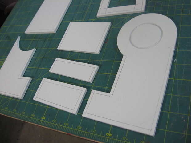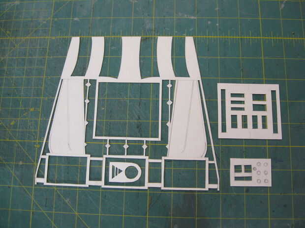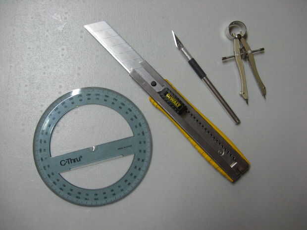 Para hacer esto, había algunas herramientas sin que solo no podía hacer. Aparte de lo básico como pegamento blanco, pegamento y tijeras, usé un cuchillo con una hoja extensible estilo snap, un compás, un transportador (una versión redonda de 360 grados), una regla métrica y una cuchilla exacto con un montón de hojas extra.