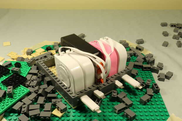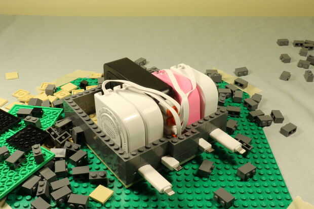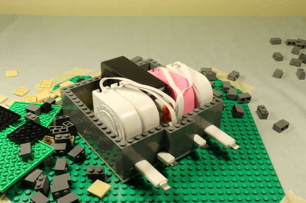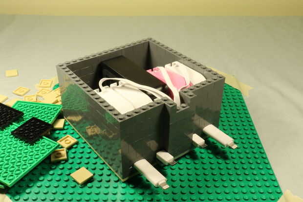 Producto final: LEGO retráctil carga estación versión 2Diseñé esta versión 2 se parecen más a un edificio de oficinas con teléfono, estacionamiento en el techo.Una 4-Port 40W 8A USB estación de carga de piezas de Lego. Esta estación de carga consiste