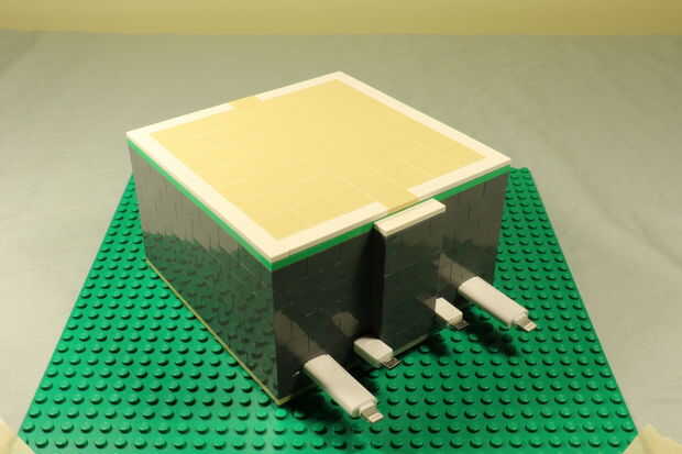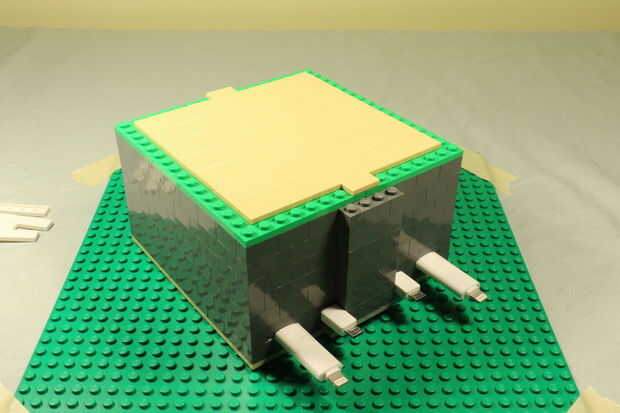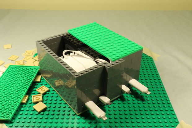 Producto final: LEGO retráctil carga estación versión 2Diseñé esta versión 2 se parecen más a un edificio de oficinas con teléfono, estacionamiento en el techo.Una 4-Port 40W 8A USB estación de carga de piezas de Lego. Esta estación de carga consiste