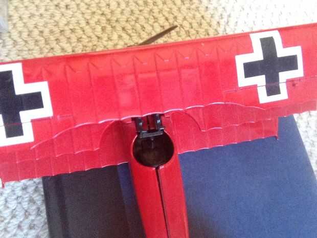 Este plano tiene tres alas. La superior tiene el símbolo del avión alemán. Hay dos polos rojo y dos papas de madera para el ala.