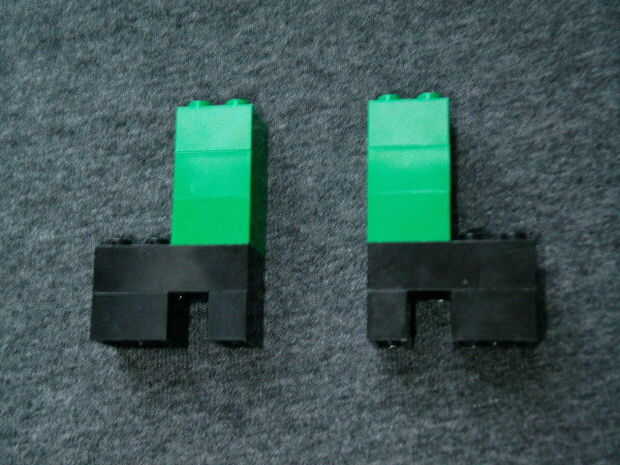Uso 2 negro 1 x 2, 2 negro 2x2s, 2 negro 2x4s y 6 verde 2x2s para hacer dos juegos de pies y piernas como se muestra.