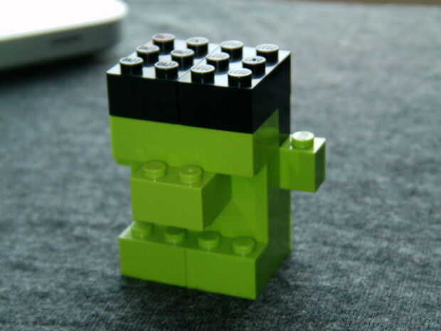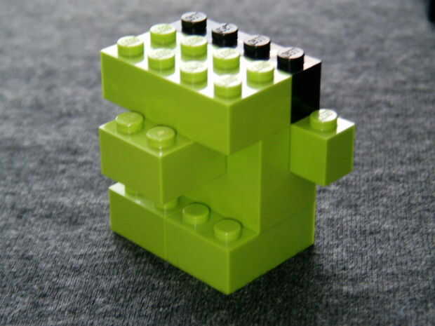 Apilar una cal 2 x 4 en la parte superior 2 cal 2x3s. Un 2x3s de cal cal 1 x 4 y 2 en el siguiente nivel de la pila. Hacer la nariz colocando un cal 2 x 2 en la parte inferior de una cal 2 x 4 y sumarlo a la cabeza. Añadir la primera capa de pelo añadiendo un negro 1 x 4 para este nivel y rellenado con 2x3s negro 2. Fijar la cabeza al cuerpo y que acaba de crear un monstruo de piel verde. Ahora lo hacen caminar rígidamente haciendo ruidos extraño monstruo. RRRRGGGAAAAAHHHH