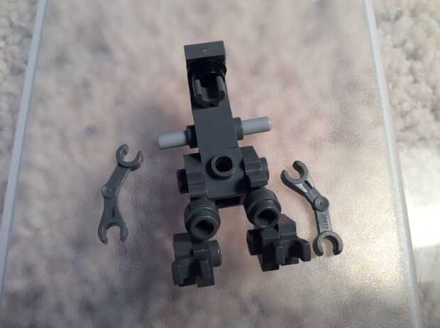 Easy step! Tomar una luz gris (u oscuro si lo tiene) y pegarlo por la parte superior del cuerpo. Luego, tome dos brazos droide y fijarlos sobre las piezas de la palanca que se sobresalen.