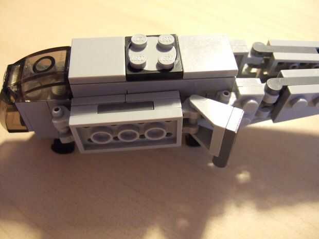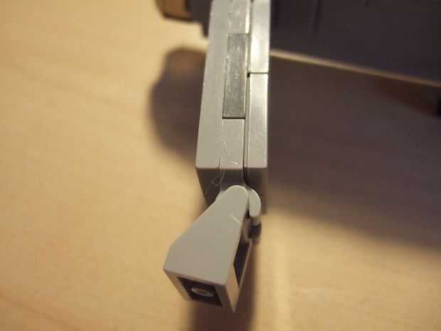 10. Doblar la pierna hacia adentro, hacia el cuerpo como se muestra. El azulejo de 1 x 2 con un clip vertical debe apoyarse en el brazo izquierdo ligeramente, y las rejillas de los azulejos deben estar tocando el cuerpo