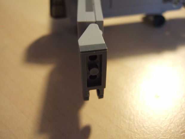 8. Clip de un azulejo de 1 x 2 con una barra horizontal en el clip restante hacia arriba de frente. La pendiente debe ser orientada hacia afuera.