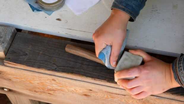 Al día siguiente, estoy formando la manija, y estoy usando un afeitado de habla que es una de mis herramientas preferidas. Sólo asegurándose de que el mango es agradable y suave para agarrar sin cualquier esquinas filosas. También hacer la parte final aquí. Luego lijar un poco, a partir de grueso y móviles más finos. Y por último estoy aplicando algunos de mi polaco de cera de abejas aceite de tung para un final agradable.