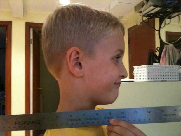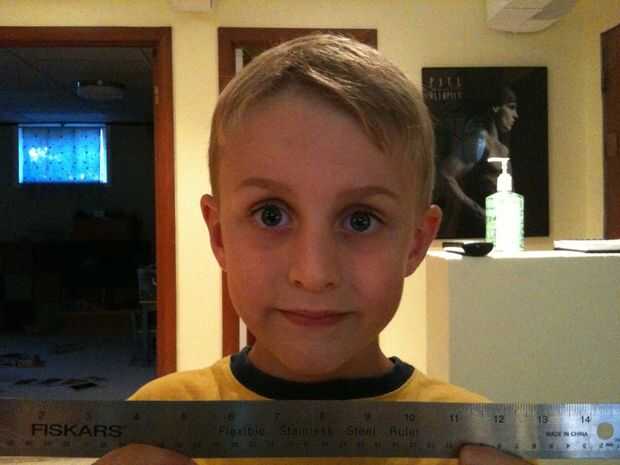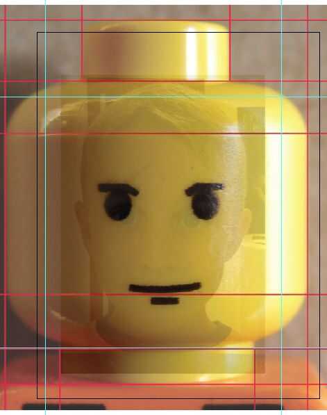 Para conseguir la cabeza grande suficiente mi hijo, y todavía tiene las proporciones correctas que tenía que hacer algunos trabajos en photoshop. Primero he buscado en google y encontró un tiro recto de una cabeza del minifig. He añadido las líneas en photoshop para romper la cabeza en formas básicas. El quid, la parte superior y parte inferior, el cilindro de la cara principal y la abertura del cuello. Entonces tomé una foto de mi hijo sosteniendo una regla. En photoshop había redimensionado la imagen hasta la escala de la imagen iguale la escala de la regla en photoshop. Luego agrega la capa del minifig como semi transparente y tamaño hasta que parecía que el niño aún serían capaces de respirar cuando encerrado en poliestireno (un requisito de su madre).