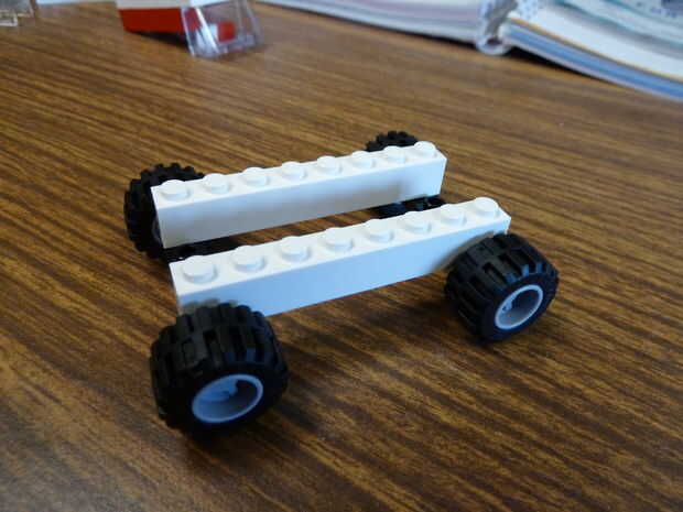 Conectar los dos 1 x 8 ladrillos a los árboles en los alfileres más externos, más cercanos a los neumáticos. Los ejes deben estar al final de las piezas el 1x8s no cuelgue a todos como se muestra aquí.