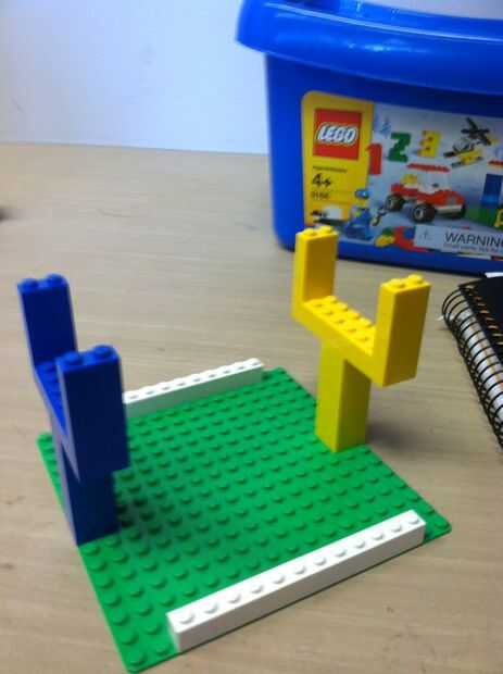 Paso 8: montaje de campo de poste. Coloque los postes de meta a los ladrillos de color correspondiente y tener la alineación correcta.