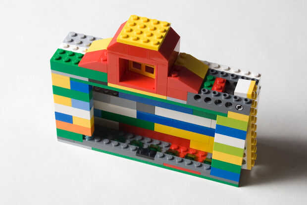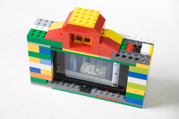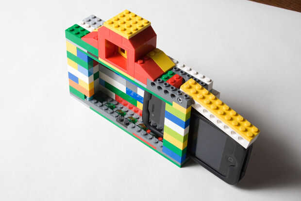 Este diseño cuenta con un objetivo ornamental de una rueda, un visor y disparador falso. Como se puede ver en la parte frontal de la cámara, hay una abertura para el objetivo real del iPhone. La parte posterior de la cámara cuenta con una gran apertura que permite tener acceso el botón de inicio y la superficie entera del tacto del teléfono. Una característica importante de la comodidad es la bisagra del lado fo la cámara que permite la fácil inserción y extracción del teléfono. Mientras que los botones de volumen y bloqueo no son accesibles cuando el teléfono está en el caso, puedo fácilmente bloquear el teléfono al abrir la puerta lateral y presionando suavemente el teléfono hacia adentro para que el botón de bloqueo se presiona contra la pared opuesta de la caja del Lego.