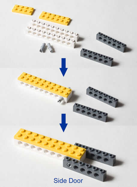 Primero coloque los 2 ladrillos NXT ya de lado a lado y presione los ladrillos planos encima de ellos para mantenerlos juntos. A continuación, inserte los postes grises en los agujeros laterales en un extremo de los ladrillos NXT. Luego coloque los ladrillos NXT 1 x 6 en el otro extremo del poste.