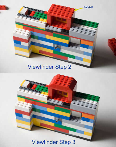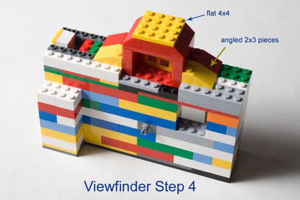 La tapa del visor con un ladrillo de 4 x 4 plano para mayor estabilidad. Por último, añadir los ladrillos angulares de 2 x 3 a los lados del visor.