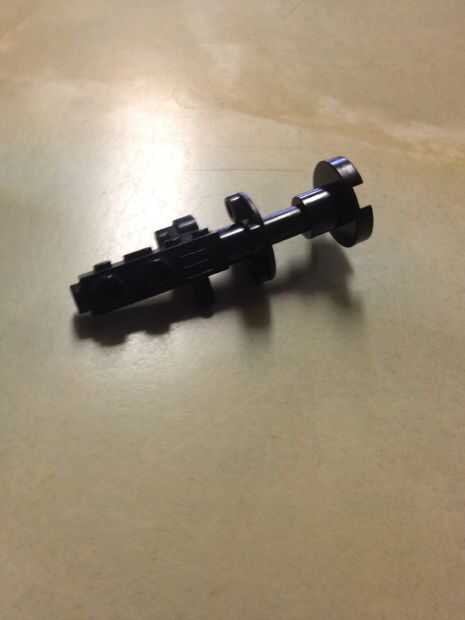 pistola hecha con piezas de Lego estándar y bandas de goma. La revista puede almacenar 6 balas.Tira el percutor hacia atrás y consigue bloqueado. Cuando el gatillo, el percutor se libera y empuja la bala más superior del cañón.El rango exacto depende