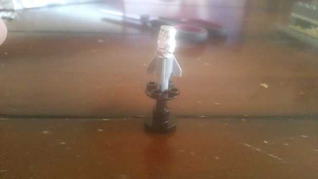 Tomar el Lego en forma de cono y envolverlo con papel de aluminio, dejando algo de espacio en la parte inferior, pero aplanar la hoja en la punta del cono. Ahora Conecte el cono para el Lego en forma de misil, que se une a lo Lego en forma de árbol. Fije toda la pieza en el agujero de Lego final, acabado el lápiz. Ajuste la longitud de aguja empujando y tirando el Lego en forma de árbol dentro y fuera del base Lego.