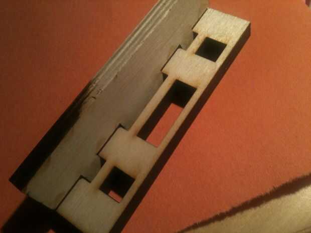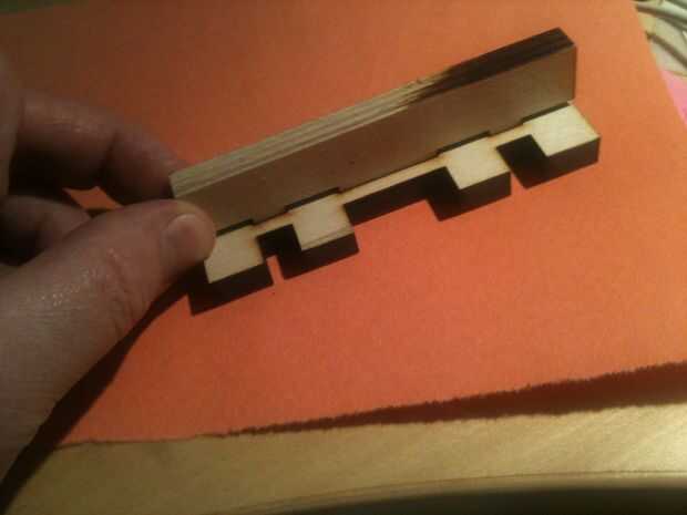 Primer paso en el laser es determinar la configuración exacta para el dedo y juntas de mortaja. El corte del laser es pequeño pero debe explicarse en el diseño para tener espacio adecuado para un conjunto de buen pegamento. Hallazgos de piezas de prueba rápida unos 0,23" es correcto para la capa de 6mm y 0,35" para 9mm.