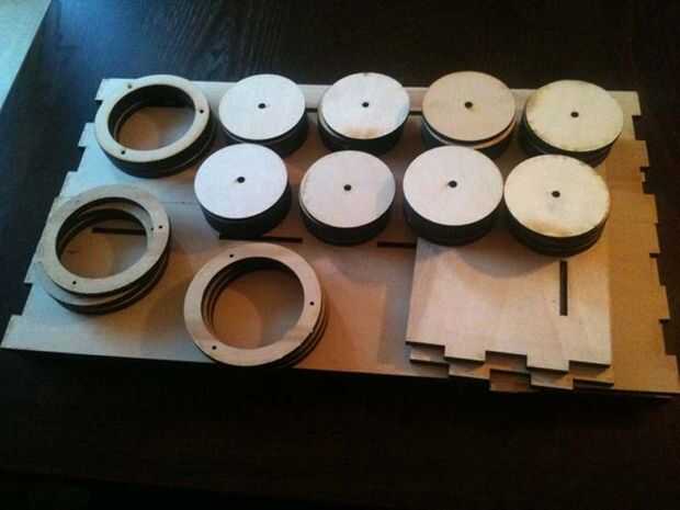La parte inferior de la caja, la pieza de alineación de la tapa y el disco superior de las protuberancias están hechas de madera contrachapada de 1/4" y el resto es 3/8". Consideré hacer la caja entera de 1/4" pero viendo mis hijos subir y colocar en cada caja, tina o recipiente he decidí ir la ruta más robusto.
