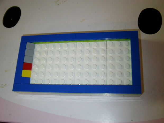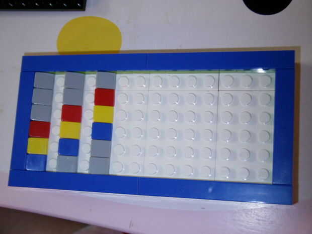 Ahora es el momento para trabajar en la imagen del arco iris. Colocar la primera fila de queso lopes contra el lado izquierdo del bastidor como se muestra en la imagen. Todas las pistas de queso deben estar pendiente a la misma dirección (mina tenía la gama alta contra el marco). Saltarse una fila de postes de madera y agregar la segunda fila, asegurándose de que la pendiente va a la misma dirección que la primera fila. Mantenga saltar y Agregar filas hasta que todas las 7 filas del arco iris se unen a la base, todas las pistas de la misma dirección.