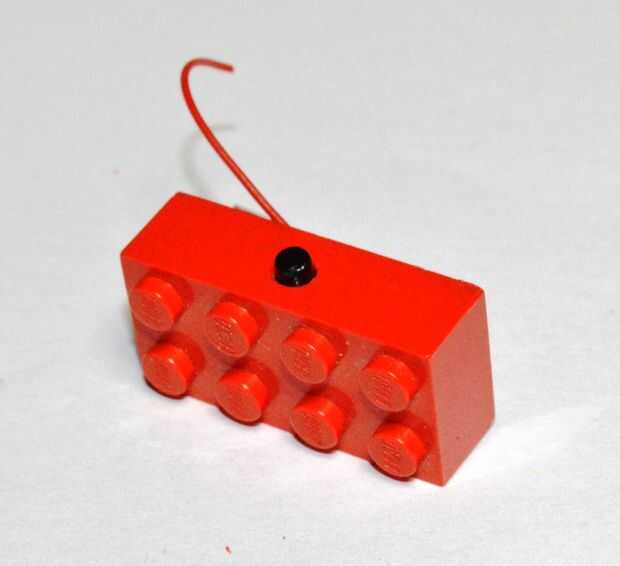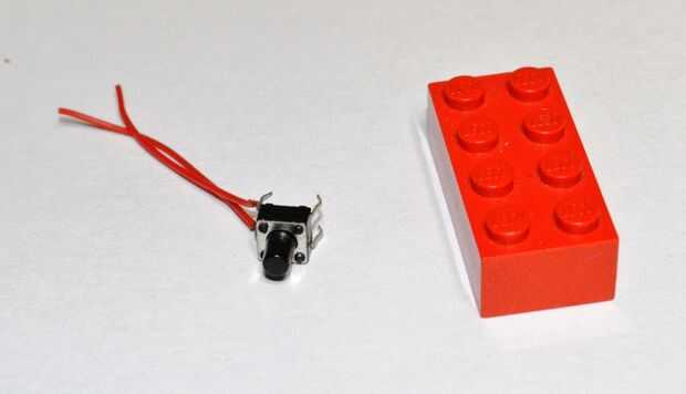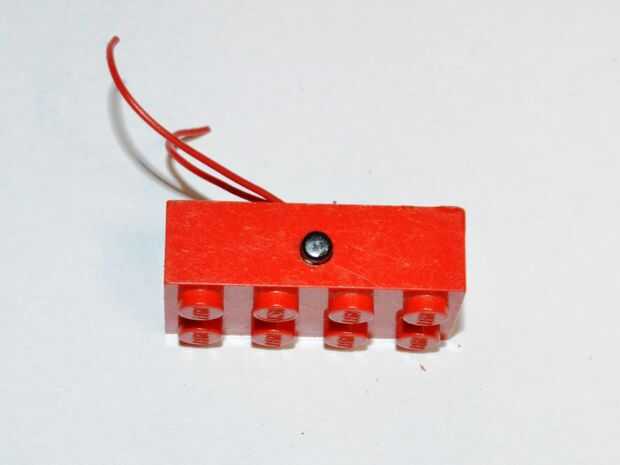 A parte del pilar central dentro del Lego bloquear y empuje el interruptor momentáneo en su lugar. Mi interruptor bastante trabado en su lugar que es una buena cosa ya que no quieres utilizar el pegamento si puede ayudar. Si no es así, añadir un poco de pegamento caliente para mantener en su lugar