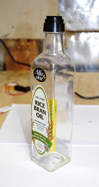1. encontrar un molde adecuado a utilizar. Fui con una botella de plástico, altura que tenía aceite en ella. Dar una buena limpieza y corte la parte superior.