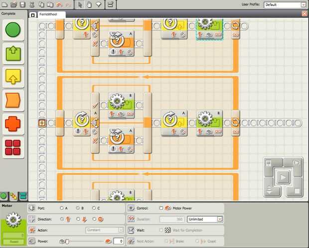 La programación es un poco difícil, pero cualquier aficionado puede encontrar la manera. El motor conectado directamente con el NXT es el control de velocidad. Esté conectado a puertos A. El motor de la rueda está conectado al puerto B.