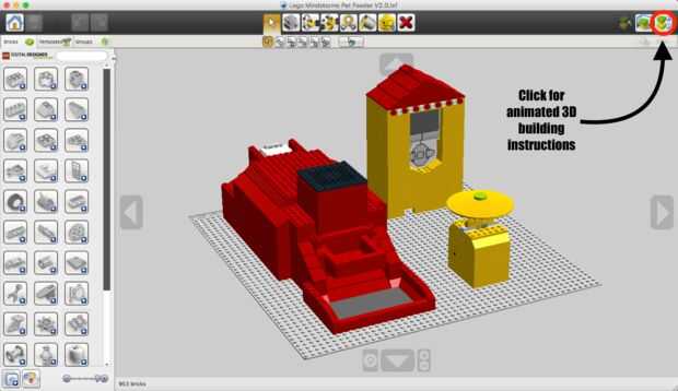 El "LEGO MINDSTORMS Pet alimentador V2.0 construir instrucciones" PDF proporciona las instrucciones de construcción paso a paso para esta creación de LEGO. Si desea instrucciones 3D animadas, debe descargar el archivo de "Lego Pet Feeder V2.0.lxf". Este archivo se puede abrir con "LEGO Digital Designer", que está disponible gratis para su descarga aquí. El archivo LDD (LEGO Digital Designer) proporciona los pasos de construcción 3D, animación. Después de haber hecho que usted tenga todas las piezas LEGO es necesarias, puede empezar a montar el alimentador tal como se describe en el PDF o archivo LDD. Luego conectar el motor al"puerto" y conectar el sensor de contacto a "Port 1" usando los cables incluidos en el Kit de LEGO MINDSTORMS EV3.