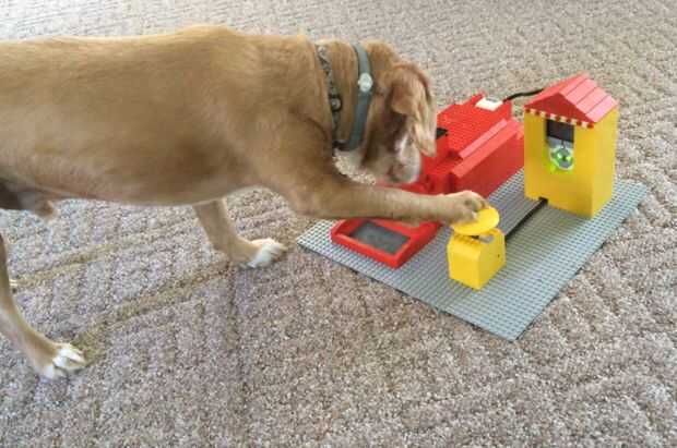 Este método requiere que el perro ya sabe el comando de "pata" (poniendo su pata en la mano cuando dices "la pata"). Antes de proceder asegúrese de que su alimentador de mascotas LEGO MINDSTORMS funciona correctamente y está lleno de alimentos para mascotas. (Para cargar el alimentador del animal doméstico, tome la tapa negra de la máquina y se llenan de alimentos). Por debajo de la tapa son paredes blancas que ocultan el alimento de animal doméstico, si quieres que el alimentador para más comida, usted puede construir las paredes blancas superior.