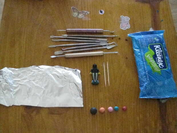 Materiales: Herramientas de arcilla, arcilla polimérica, dos palillos de dientes, una persona LEGO, hoja de lata y toallitas de mano (para la limpieza de las manos).