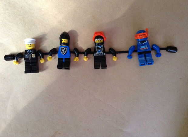 -Cortar un trozo de cordón de cuero que se ajusta alrededor de su muñeca. Alinee los brazos y los cuerpos de los minifigures a través del cable para tener una idea de lo que será el espacio en la pulsera.