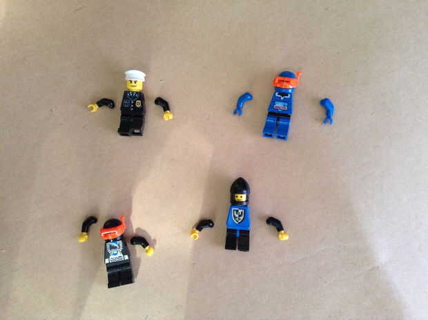 -Mirar a través de las tomas del brazo de los minifigures. Probablemente algunos se van directamente a través de todo el cuerpo, pero algunos tendrán un trozo de plástico de la manera. Perfore a través de ese plástico.