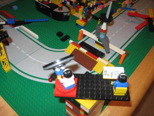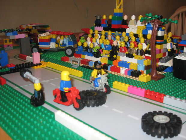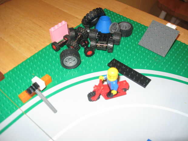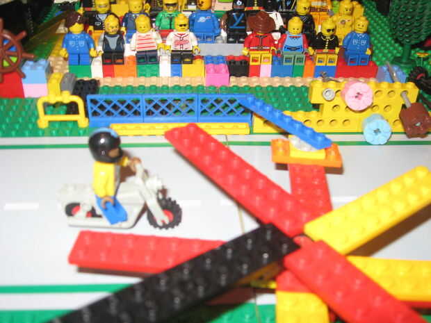 Bienvenido a wipeoutPaso 1: J & j «stand»hacer el alto pero. enogh bajo para ver el curso de wipeout agregar un área de veiwing detrás de ellos (como se ve en la foto)Asegúrese de añadir figuras mini de j & j, un director y un hombre de la cámaraP