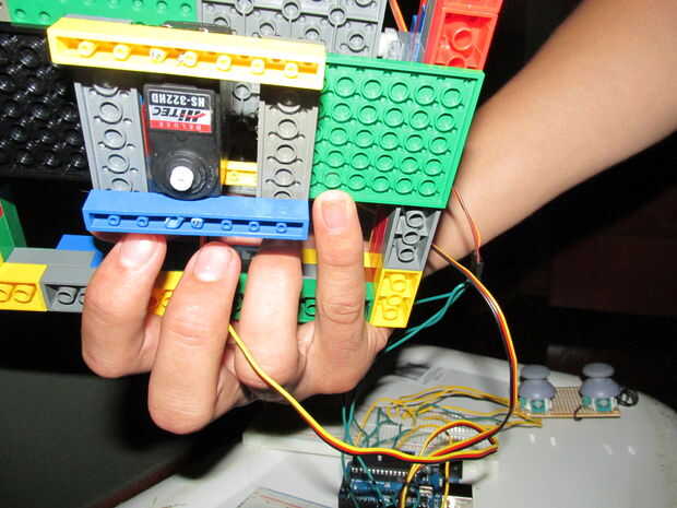 Atornillar el servo pan algunos ladrillos de 1 X 8... uno por cada lado y asegúrese de que las conexiones están apuntando lejos del conector blanco.