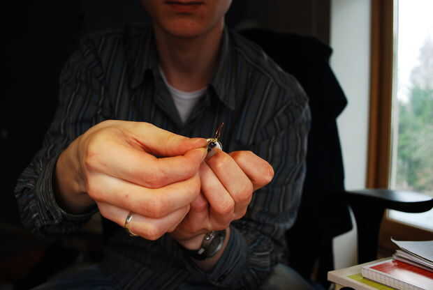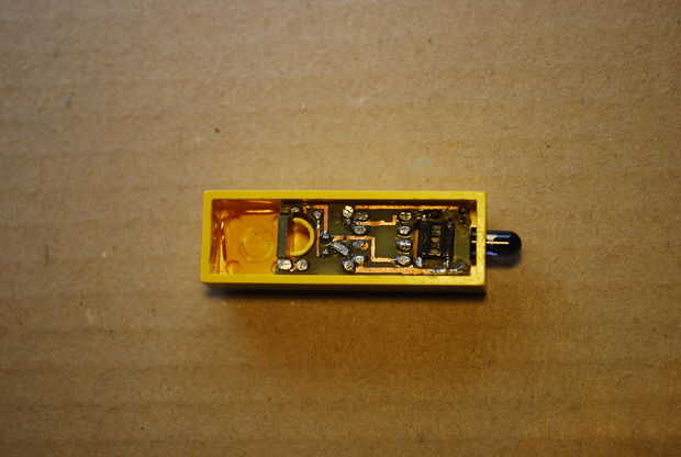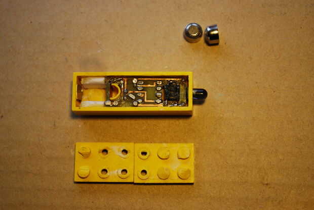 El ladrillo debe ser ahuecada, excepto un cilindro que más tarde resultó para ser la mitad de un cilindro. Un agarre y giro simple con las pinzas hizo un buen trabajo. También dos agujeros deben taladrarse. Tuve una LED de 5mm así que perforé un agujero de 5mm para el LED y un agujero de 3,5 mm para el botón. Asegúrese de que no taladre los orificios en el extremo incorrecto como lo hice al principio. Suerte, tuve otro ladrillo de sobra. Lo sentimos, no hay foto del ladrillo perforado.