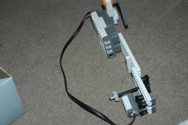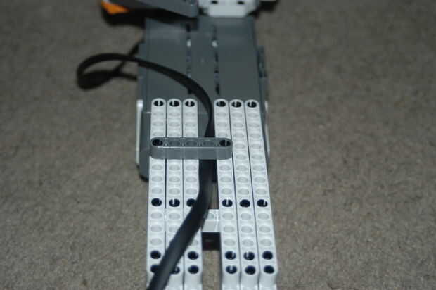 Puso un extremo del cable en el sensor de contacto y el otro extremo en un puerto en el dispositivo NXT.  Luego coloque el cable en el hueco en el centro del cuerpo y colocar un conector stick por encima de él para mantenerlo fuera del camino.
