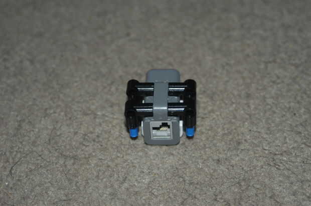 Reunir un sensor de toque, cuatro conectores de ángulo recto y 8 conectores azules (son doble cara-por lo que tienen un conector diferente en cada lado). Poner un conector azul en cada orificio de los conectores de ángulo recto y fijarlos en el sensor de contacto.
