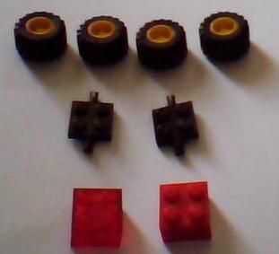 es todo negro excepto las ruedas y rueda conectoresPaso 1: piezas Ok en este paso se necesita 4 ruedas, 4 espárragos negro pequeño, 1 negro liso cuadrado, 2 conectores de rueda, 1 parabrisas, 3 rectangulares 8 piezas, 3 dos piezas, una reja, 2 piezas