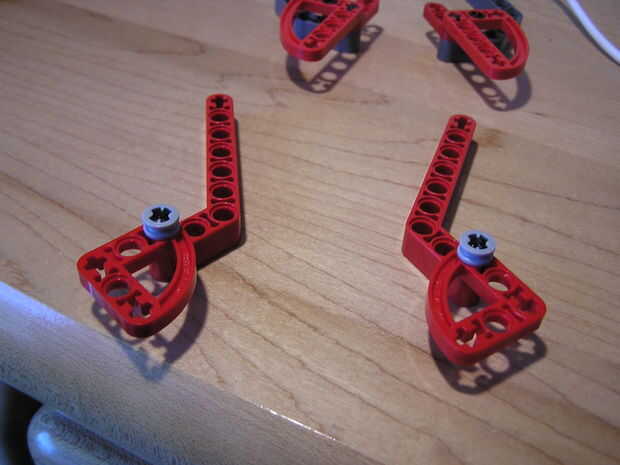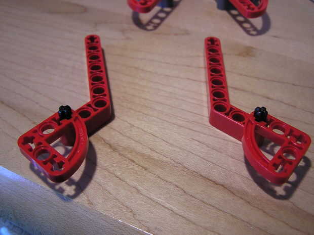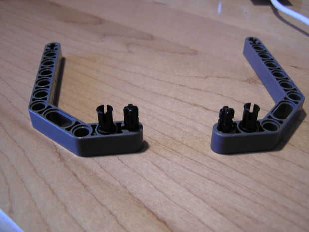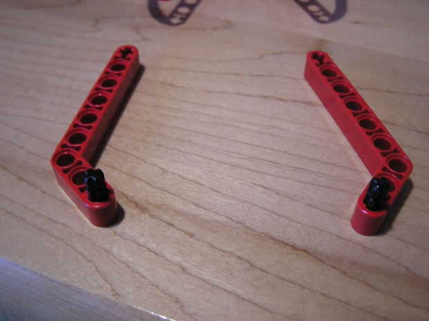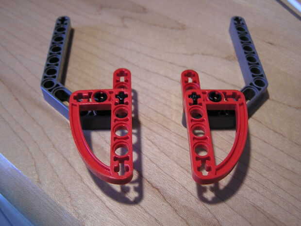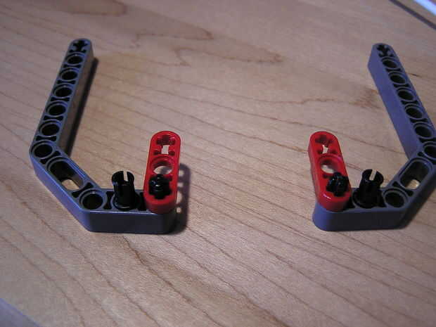 Tomar las dos piezas largo gris y Deslice dos número dos árboles en el lado corto del brazo. En el orificio debajo del eje encaje un conectador snap en el agujero. Ahora deslice sus dos tres agujero brazos rectos (rojo) sobre los ejes. Ahora deslice los conectores de arco largo en el snap y los conectores de eje. Ahora se acaban las patas delanteras. Para los pies traseros tome la roja 45 grados los brazos y deslice los ejes número dos en el extremo de shert de las piernas. Deslice los conectores de arco corto sobre los árboles una tapa los extremos con espaciadores de espesor medio.