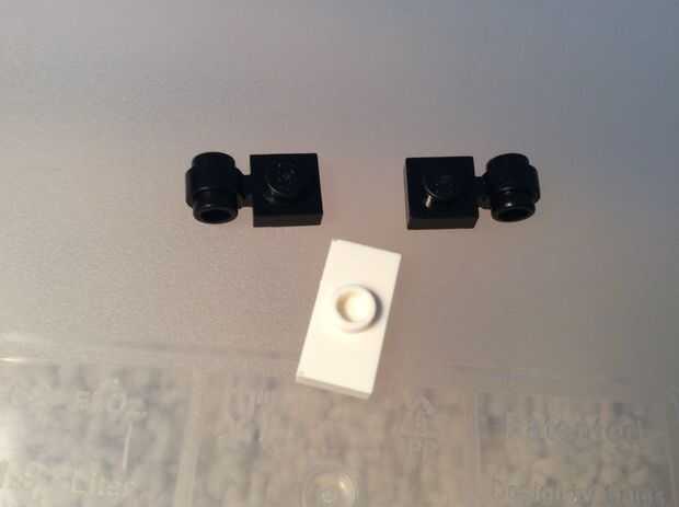 Para empezar la torreta, tome una placa de puente blanco y negro dos 1 x 1 con postes de madera y colocarlos como tal.
