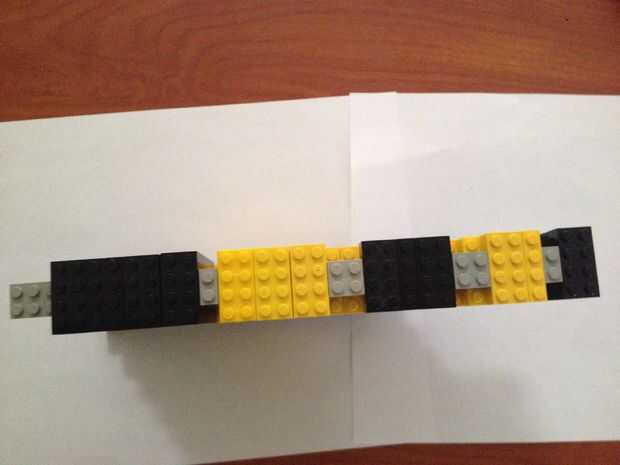 Esta capa requiere algunos "construcción temporal". En primer lugar, coloque un negro 2 x 4 en la parte superior la pieza negra de 1 x 4 en el extremo izquierdo de la capa 10 que cuelga del lado izquierdo de una fila. en la parte inferior de esta pieza, adjuntar plano, gris 2 x 10 que se extiende a la izquierda. Entonces, además de esto, coloque tres negro 2 x 4, lado a lado, a la izquierda de la primera negra 2 x 4 en esta capa. A continuación, a la derecha de la original negro 2 x 4, coloque un gris 1 x 2 directamente encima de la altura, gris 1 x 2. A continuación, de izquierda a derecha, las piezas deben ser colocadas en este orden: tres amarillo 2 x 4, un gris 2 x 2 (centrado), dos negro 2 x 4, 1 x 4 negro, uno gris 2 x 2 (centrado), uno amarillo de 2 x 4, un amarillo 1 x 4, gris 1 x 2 (centrado) y uno negro 2 x 4.