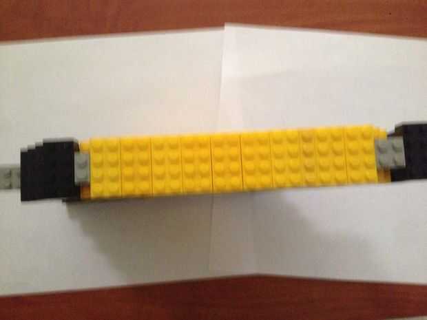 Comenzar esta capa con un negro de 2 x 4, situado en una fila de la izquierda de la capa 13. Además, centro de la pieza gris 1 x 2. Entonces, el lugar todos nueve piezas de 2 x 4 amarillo side-by-side, seguido por el amarillo 1 x 4. A la derecha de eso, centro de la pieza gris 2 x 2. Poner fin a esta capa con un negro de 2 x 4, colocada de manera que se encuentra en una fila desde el borde derecho de la capa 13.