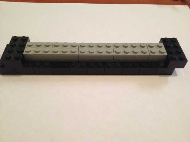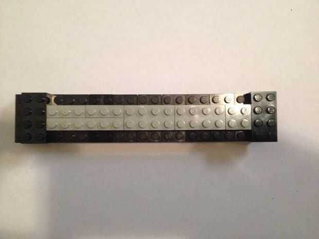 De izquierda a derecha: 1 pedazo de 2 x 4 negro sobre la capa base, en una fila a la derecha. Utilice 2 piezas de 1 x 3 gris y 1 gris 1 x 6 pieza para crear un 2 x 6. Centro de este 2 x 6 en negro para arriba base, butted contra la primera pieza negra encuentra en esta capa. Colocar las piezas siguientes end-to-end, acoplados en el extremo derecho de 2 x 6 solo puso: 2 gris 2 x 4 y 1 gris 2 x 2 (centrado). A continuación, coloque la segunda pieza negro 2 x 4 en el otro extremo de las piezas gris cuelga de la capa de base por 1 fila.